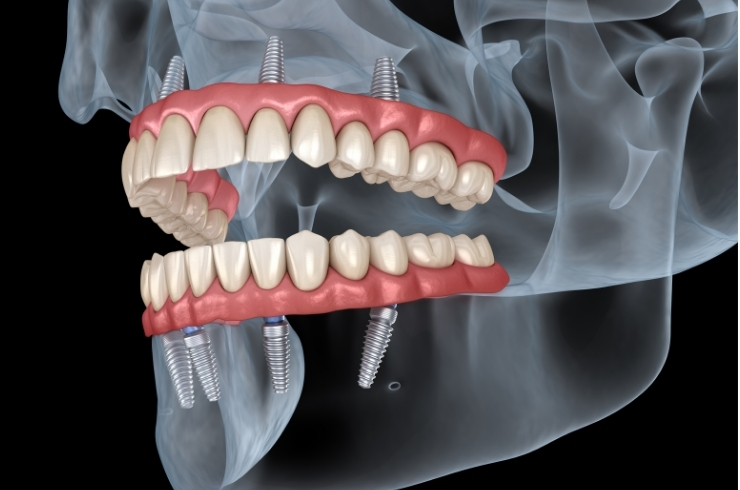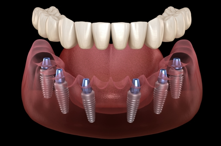 A technique where four implants support a full arch of teeth, providing a fixed, stable solution.